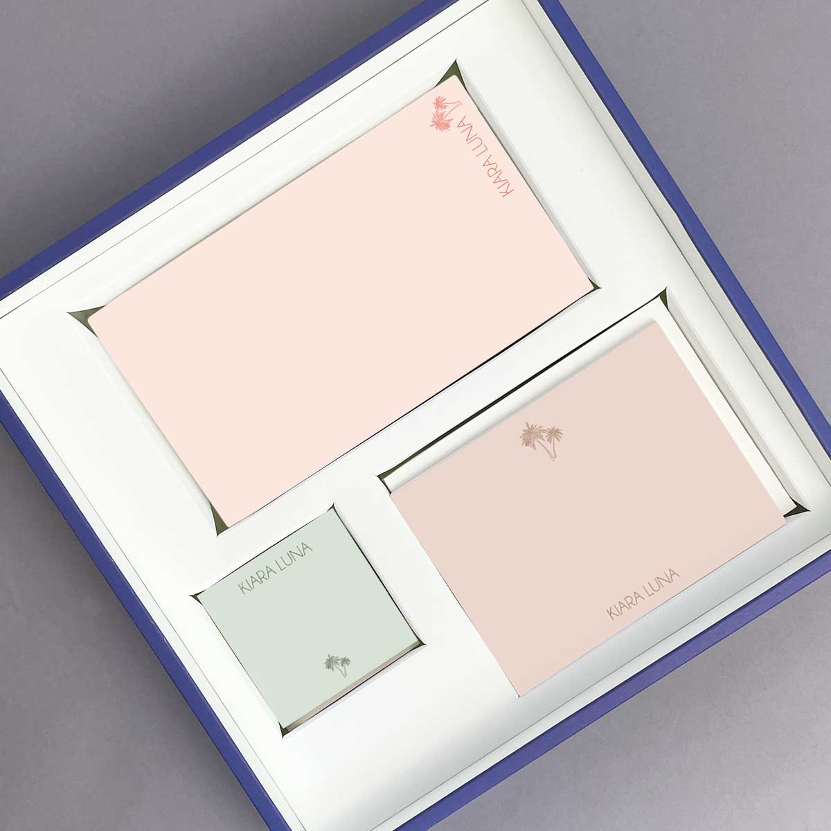 Our premium gift set is printed on textured stock with off-white hues. This set includes a notepad (84 sheets), notecards (18 sets), and mini cards (45 pcs).